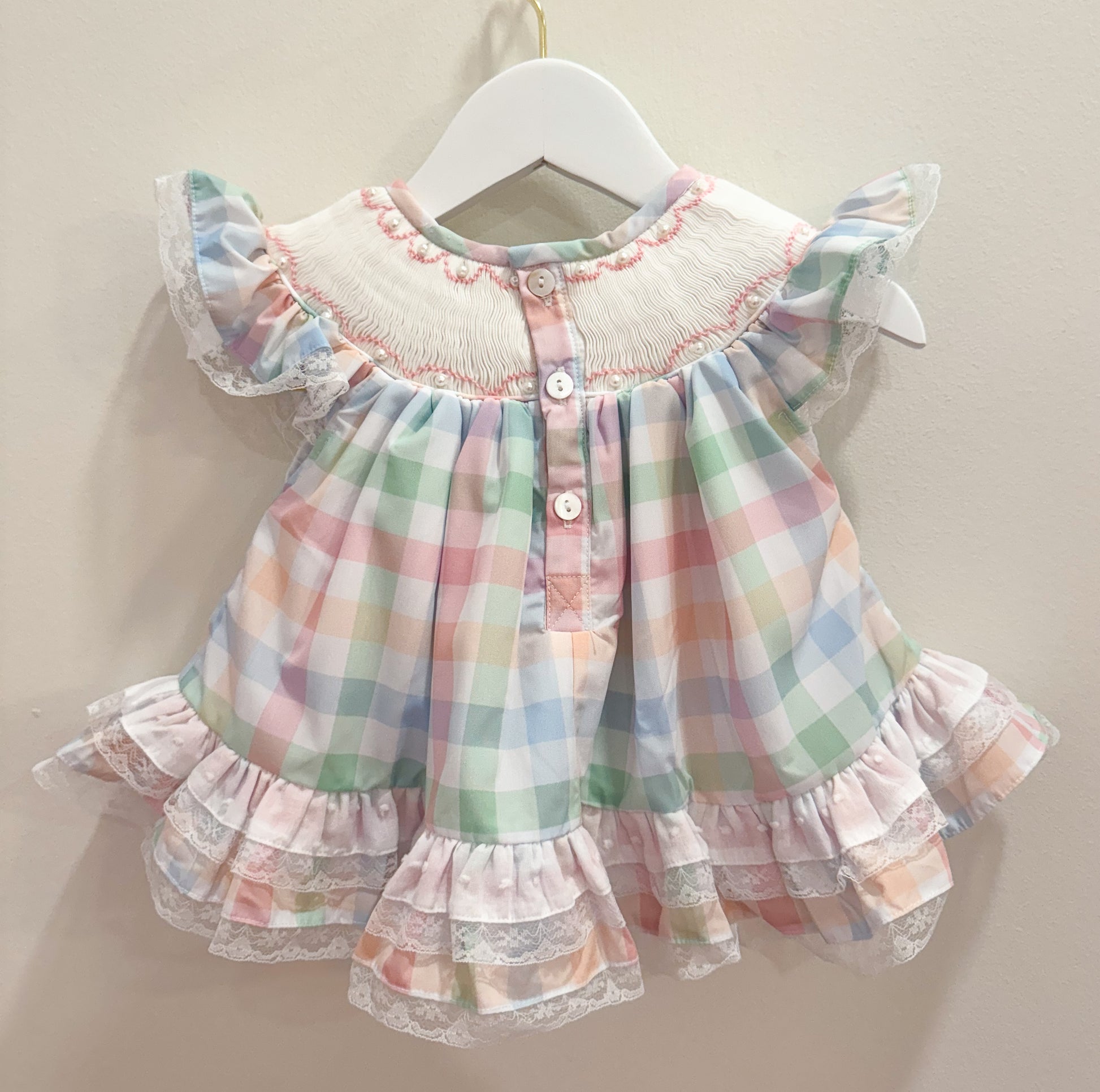 Custom Woven Cotton with Hand Smocking, 3D Pearls, + Swiss Dot + Lace Trim Details