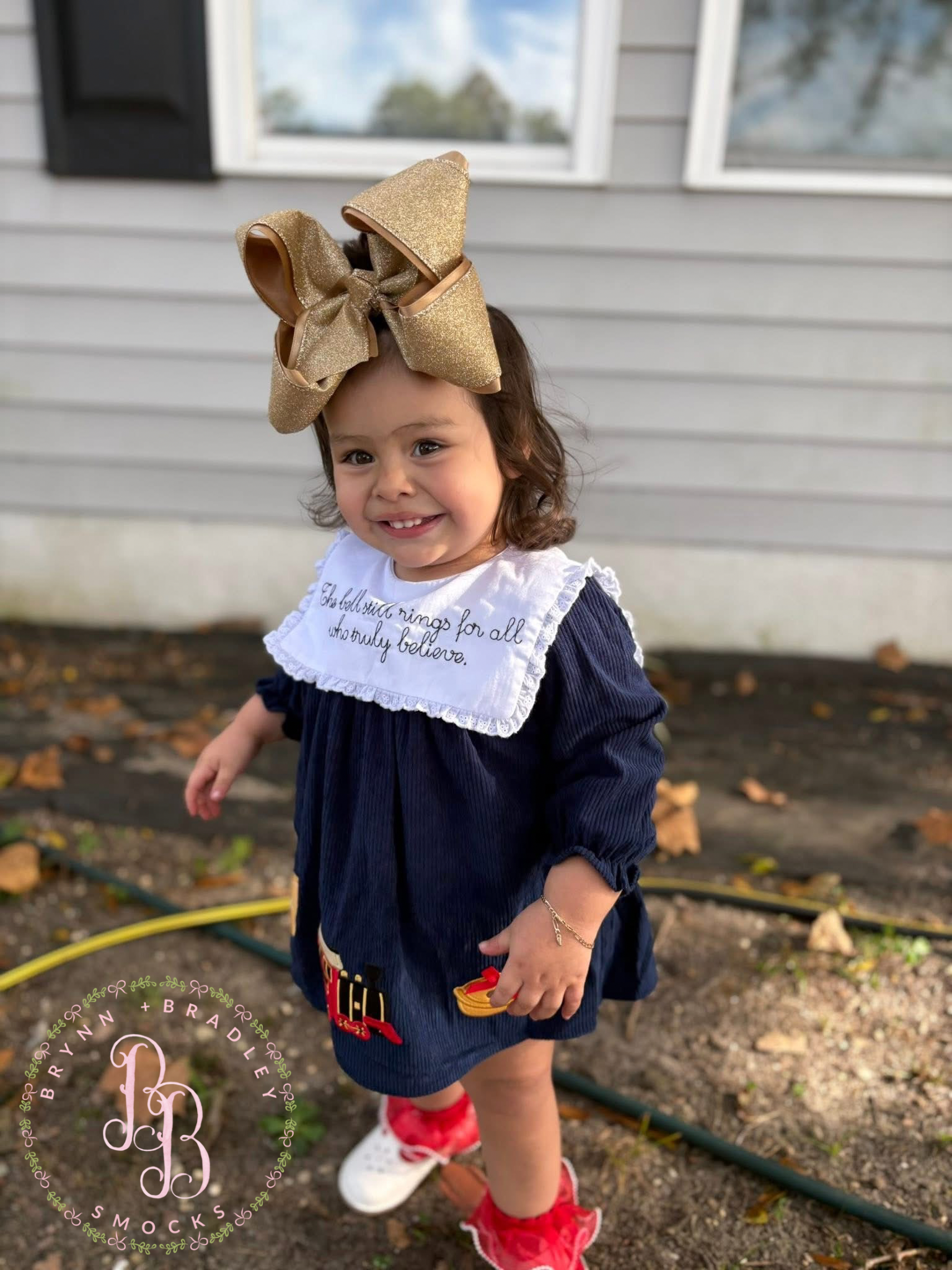 Navy Corduroy with Lace Trim, Appliqué + 3D bows, + Adjustable Tie Back Straps